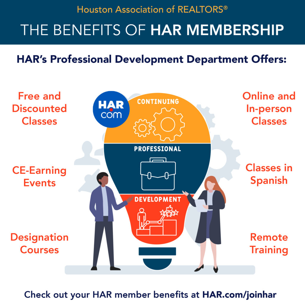 HAR’s award-winning Professional Development program equips members with the knowledge, skills, and designations needed to thrive in every stage of their careers. From nationally recognized certifications and specialty designations to innovative webinars, workshops, and leadership programs, we provide ongoing opportunities for REALTORS® to stay ahead of industry trends and deliver exceptional value to their clients. Our commitment to education ensures that HAR members remain trusted experts and leaders in the real estate community. To explore classes, designations, or schedule a remote training, click HERE.